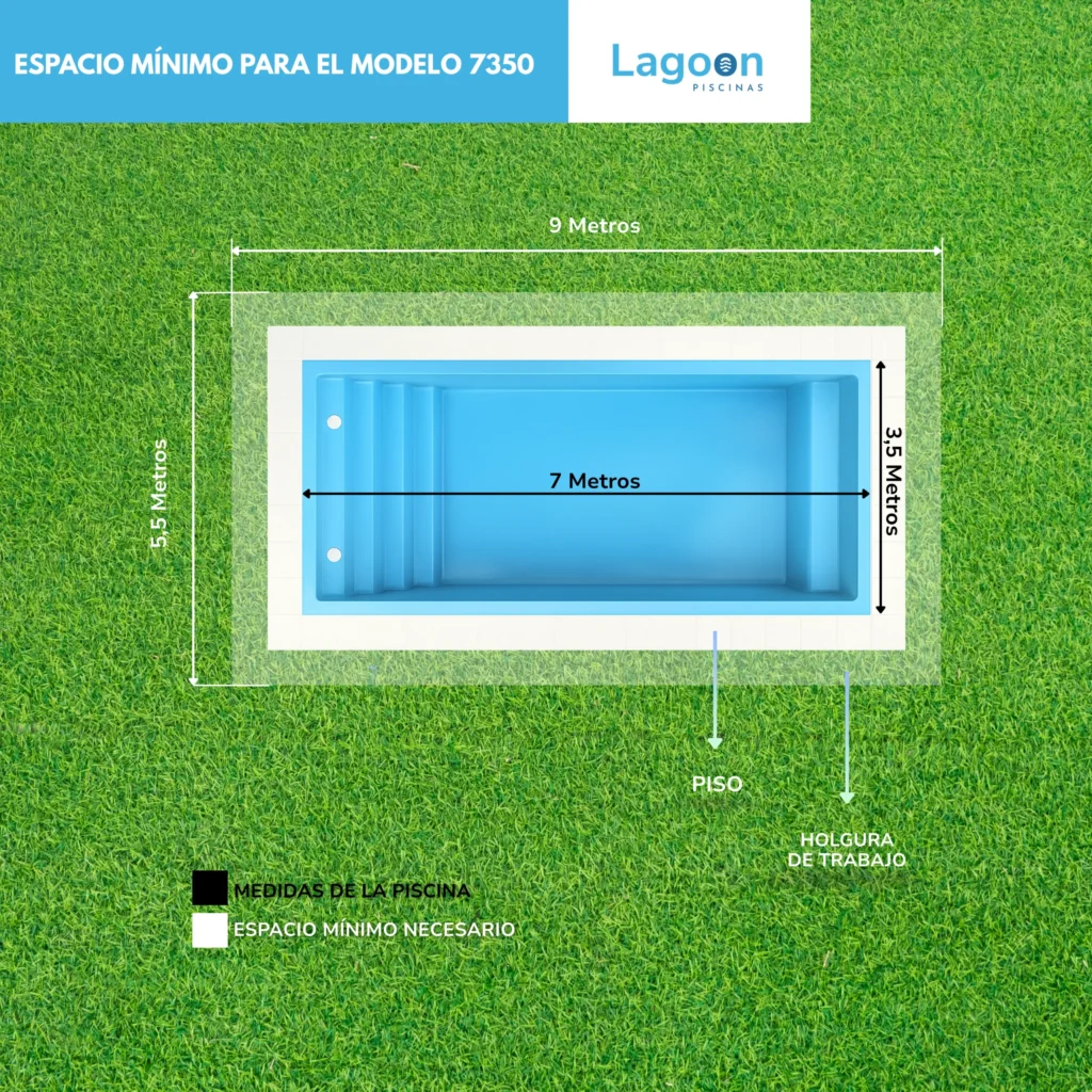 Hay una razón por la que las medidas del Modelo 7350 son un clásico atemporal. Sus 7.00 x 3.50 mts representan el balance perfecto para la vida familiar: un carril de nado generoso para los más activos y una amplitud ideal para que todos puedan jugar y refrescarse juntos. Es la piscina que se adapta a todas las edades y a todos los momentos, desde una tarde tranquila hasta una fiesta de cumpleaños.